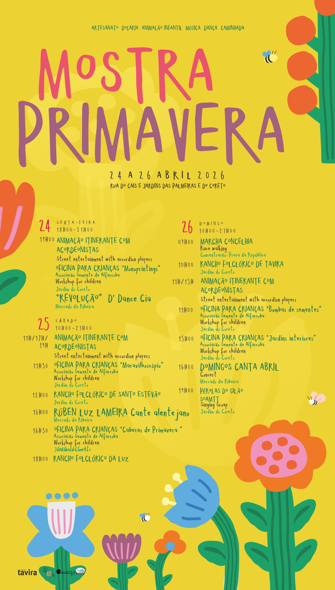 A Mostra da Primavera regressa a Tavira, entre 24 e 26 de abril, integrando as comemorações do 25 de Abril com um programa cultural diversificado e de acesso gratuito. O evento decorre no centro histórico da cidade e reúne cerca de 100 expositores com produtos tradicionais e artesanato local, valorizando a identidade e autenticidade da região. Ao longo de três dias, há música ao vivo, folclore, teatro de rua, oficinas para crianças, animação itinerante e momentos culturais que celebram a liberdade e a tradição.